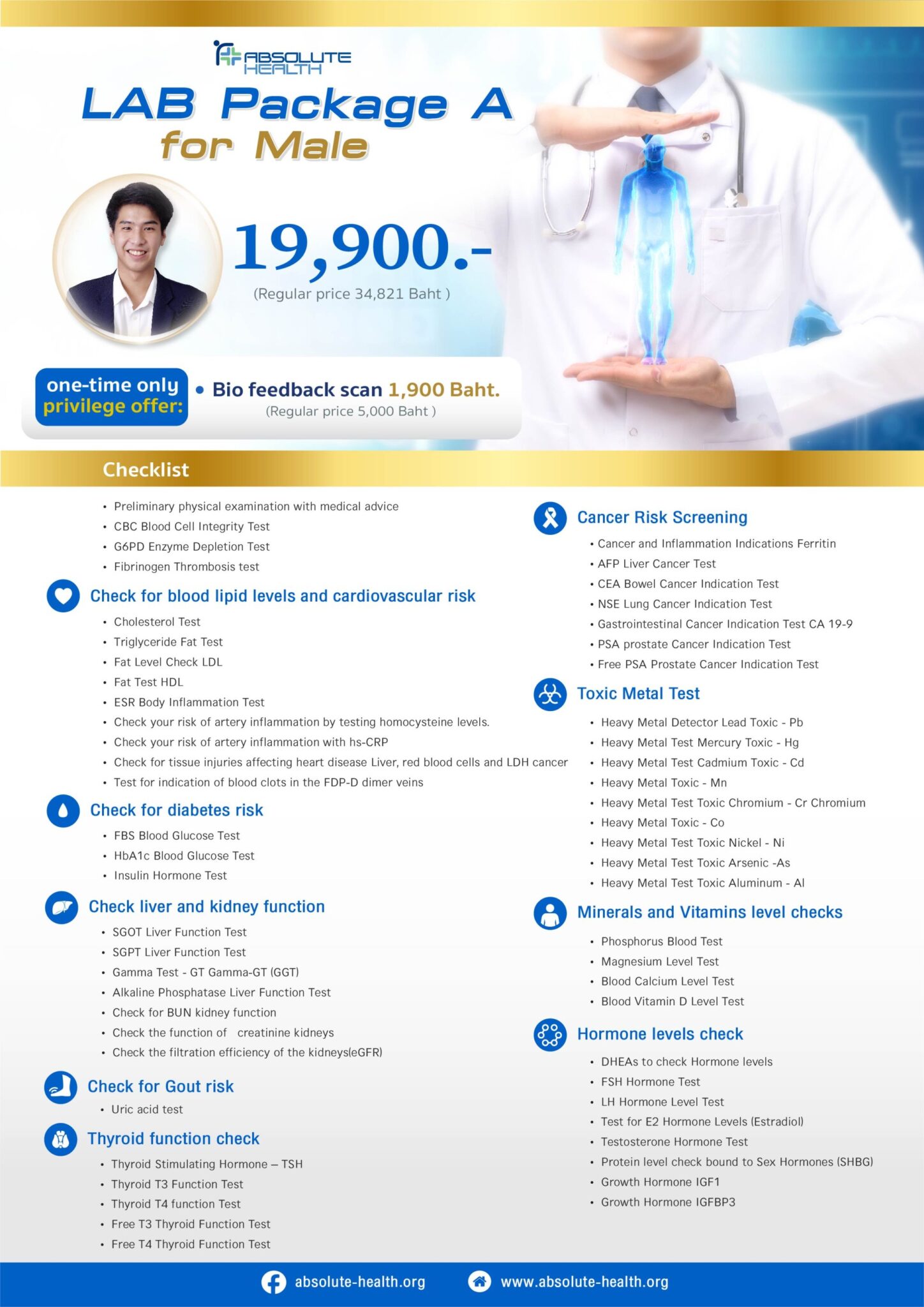 Package A: Whole Body Check Up – Male 19,900 Baht (Regular price 34,821 Baht)