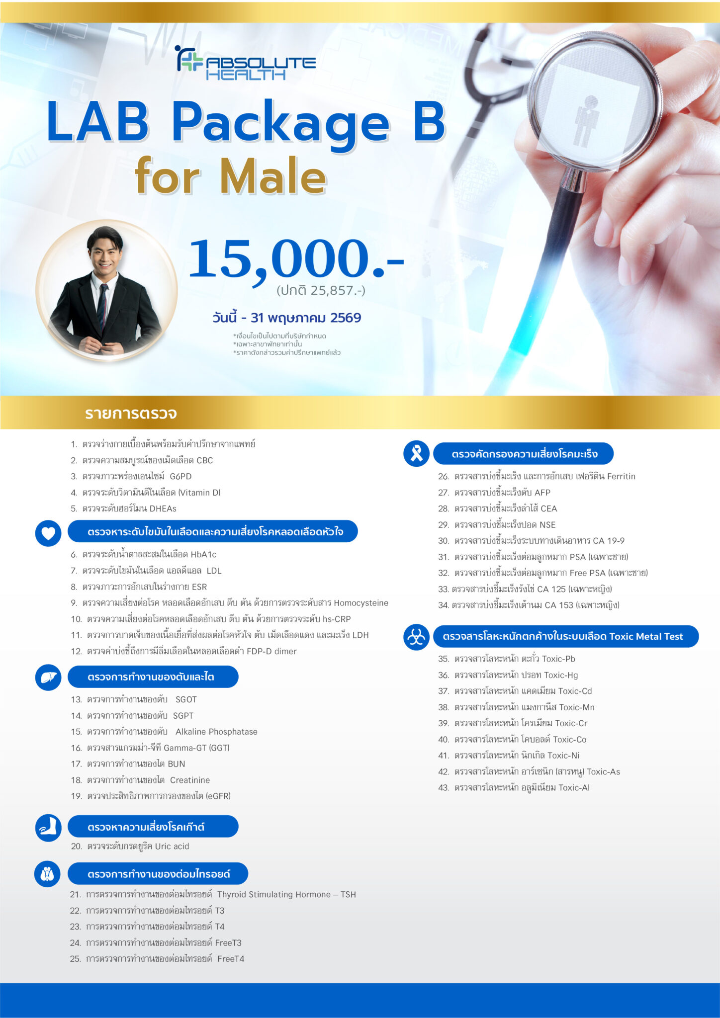 เหมาะสำหรับผู้ที่มีปัจจัยเสี่ยงต่อการเป็นโรคเรื้อรังต่างๆ จากพันธุกรรม และพฤติกรรมการใช้ชีวิต เน้นการตรวจค้นหาความเสี่ยงโรคหลัก ๆ อาทิ โรคมะเร็ง หลอดเลือดหัวใจ โรคตับ โรคไต  ไทรอยด์ รวมถึงตรวจดูระดับสารพิษโลหะหนักที่สะสมในร่างกายที่อาจส่งผลต่อสุขภาพโดยรวม
