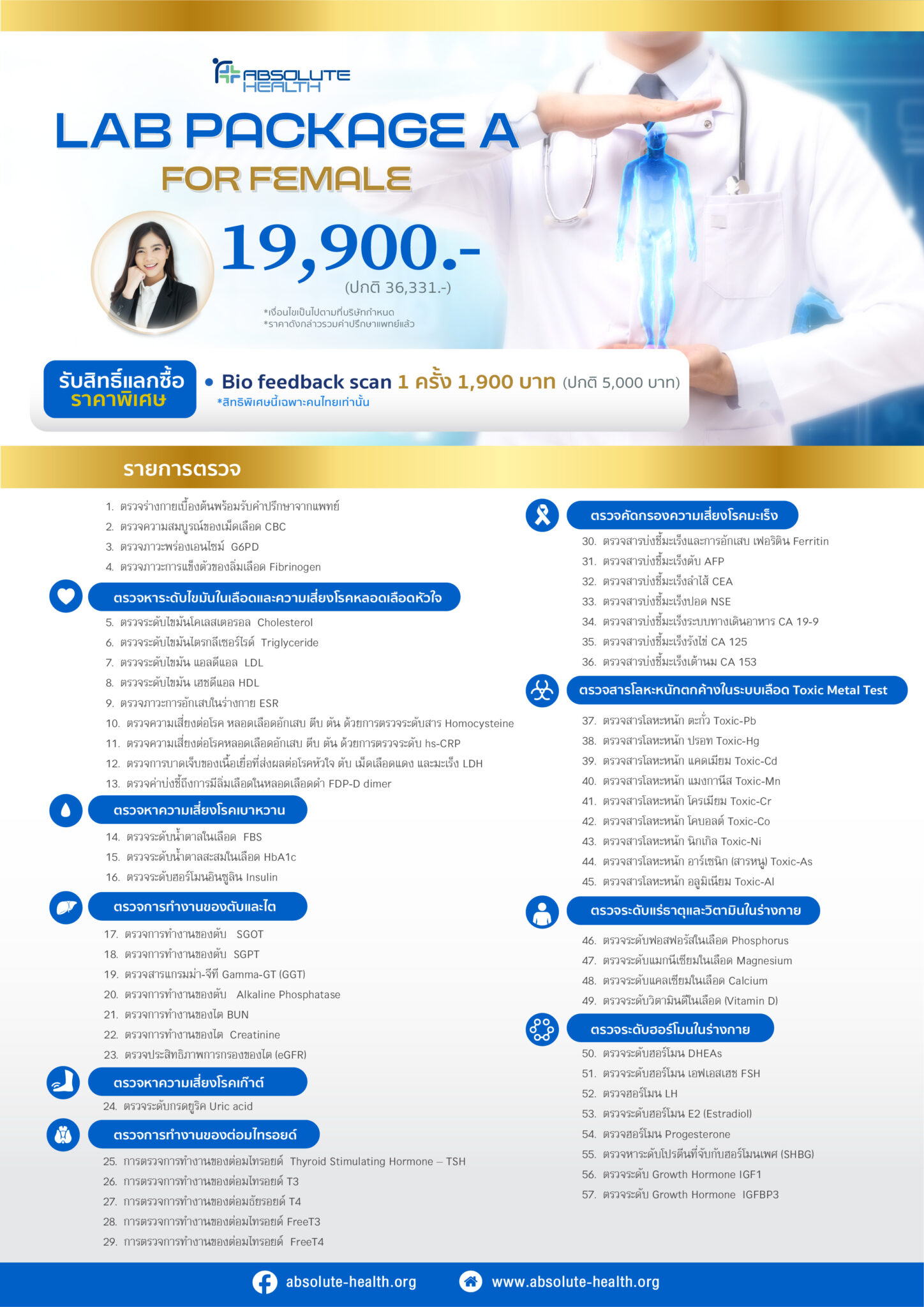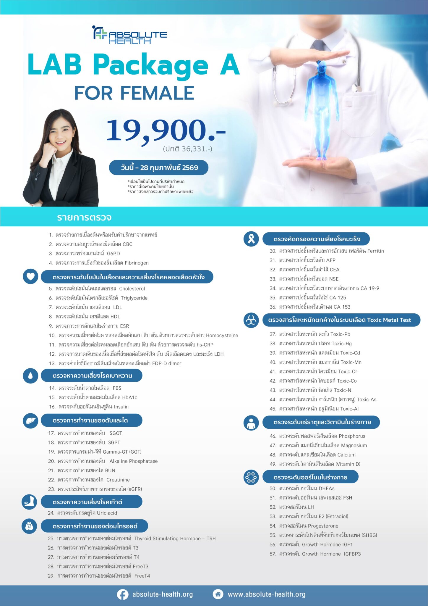 Package A : Whole Body Check Up : Female ราคา 19,900 บาท (ปกติ 36,331 บาท )