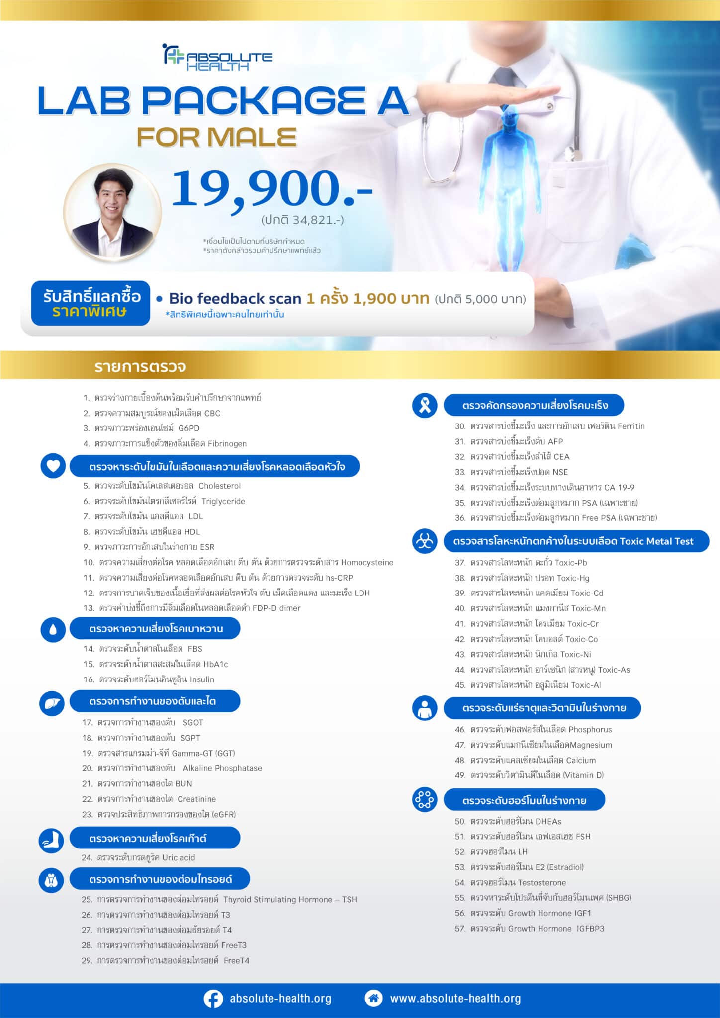 Package A : Whole Body Check Up : Male ราคา 19,900 บาท (ปกติ 34,821 บาท )